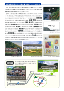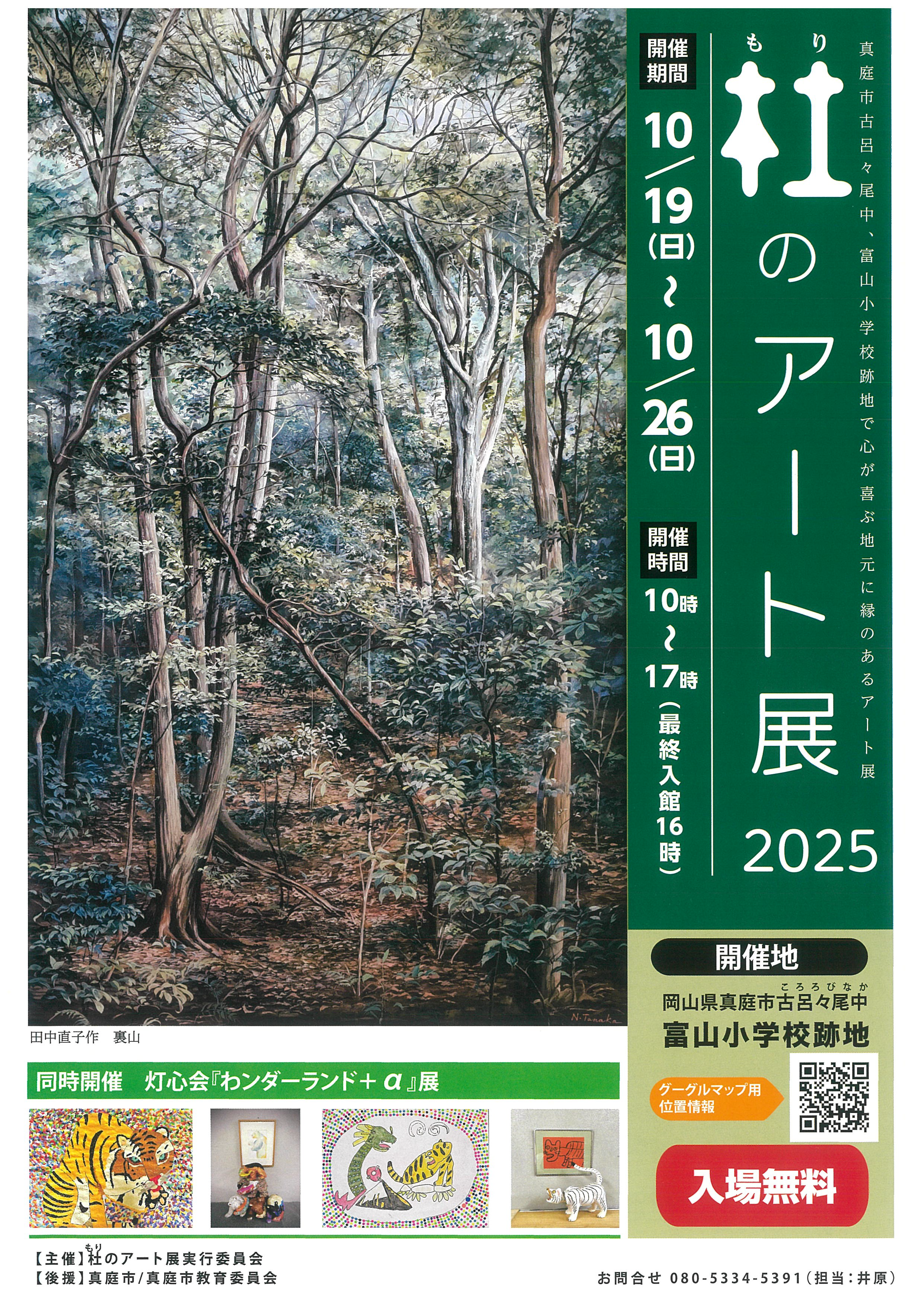 呂々尾中生まれ)の絵画、高井寛二氏(柴原生まれ)の絵画、山根義秋氏(富尾在住、「旭窯」創設者)の備前焼、原田澄子氏(古呂々尾中生まれ)の絵画、富原に移住してきたログハウスビルダー植木衆氏の木の形を生かしたベンチ、元地域おこし協力隊海野文雄氏が2020年真庭シネマカレッジにて富原の林業を題材に制作したアニメーション作品『100年のもり』の上映、さらに地元の灯心会の企画で、津山自然のふしぎ館応援企画で展示された作品と空想上の生き物をモチーフにした作品が並ぶ『わンダーランド+a』展が同時開催されます。