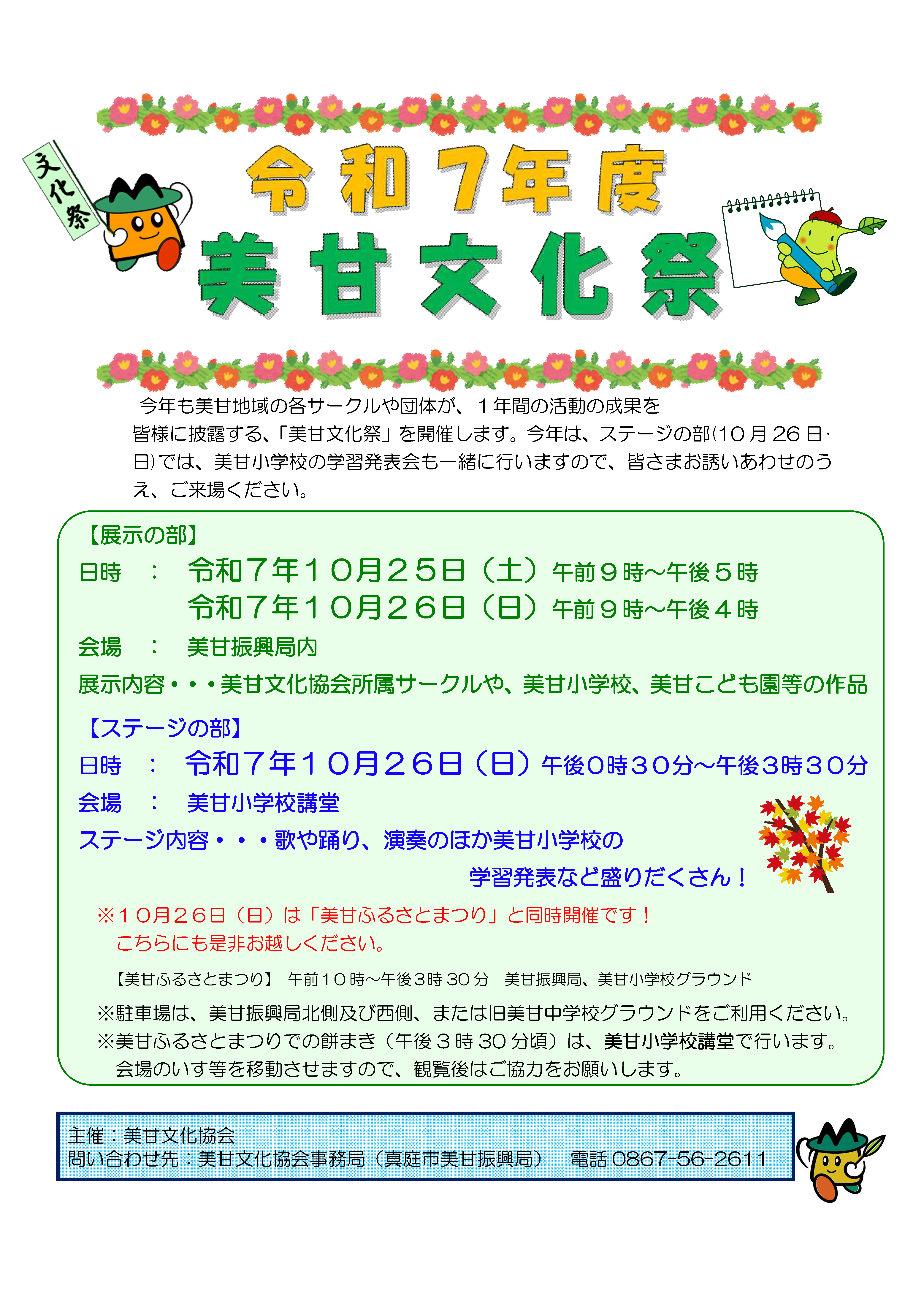 今年も美甘地域の各サークルや団体が1年間の活動の成果を皆様に披露する、「美甘文化祭」を開催します。