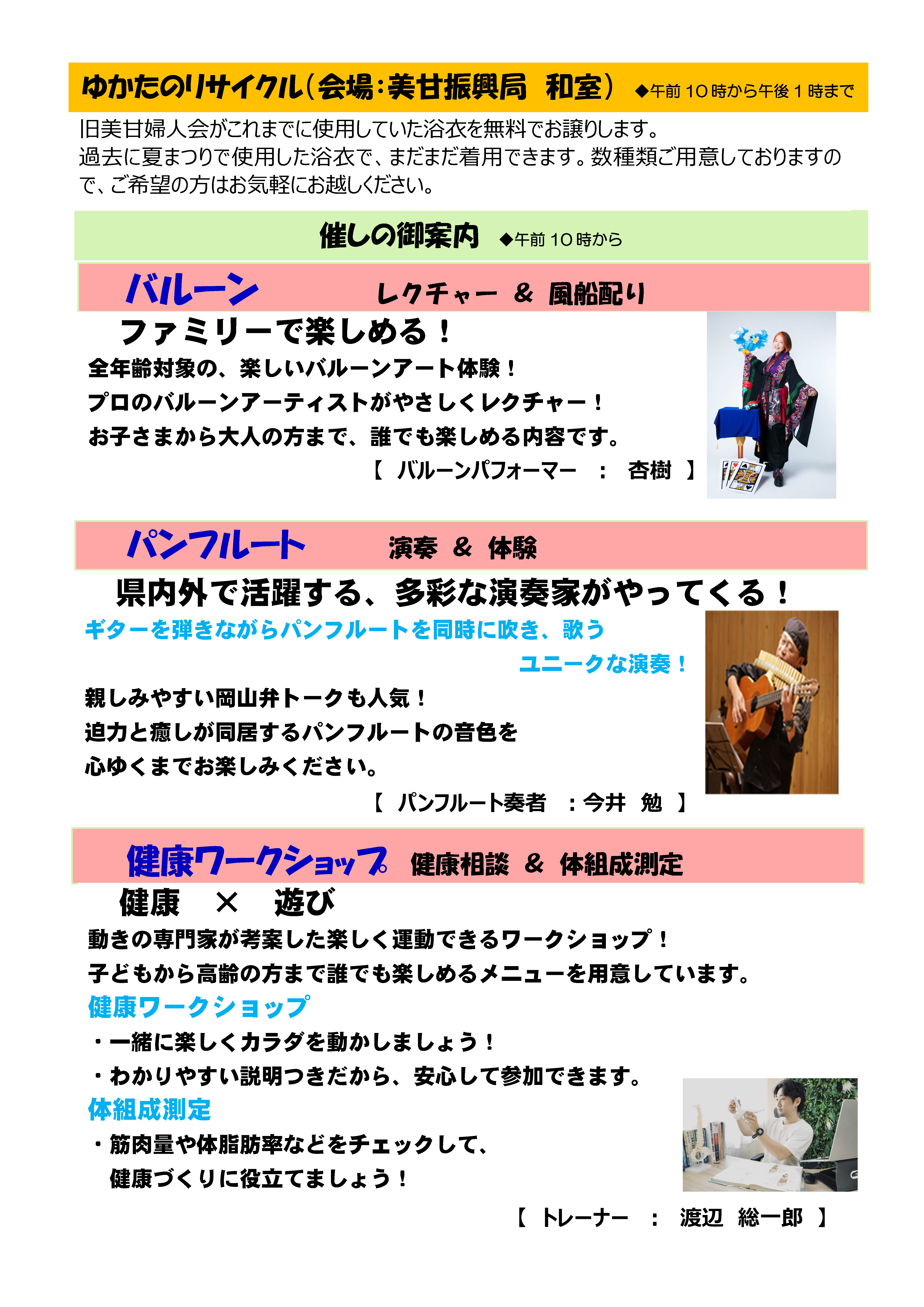 会場では、地元団体等によるバザーの出店、ゆかたのリサイクル、パフォーマーやトレーナーによる催しが開催されます!