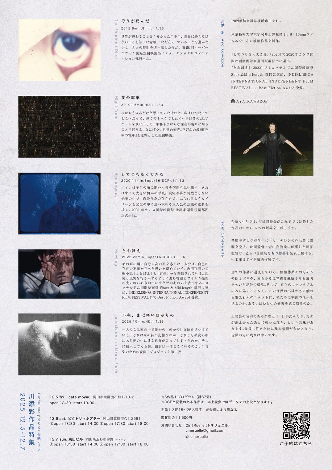 vol.5では、川添彩監督がこれまでに制作した5つの短編作品を上映します。