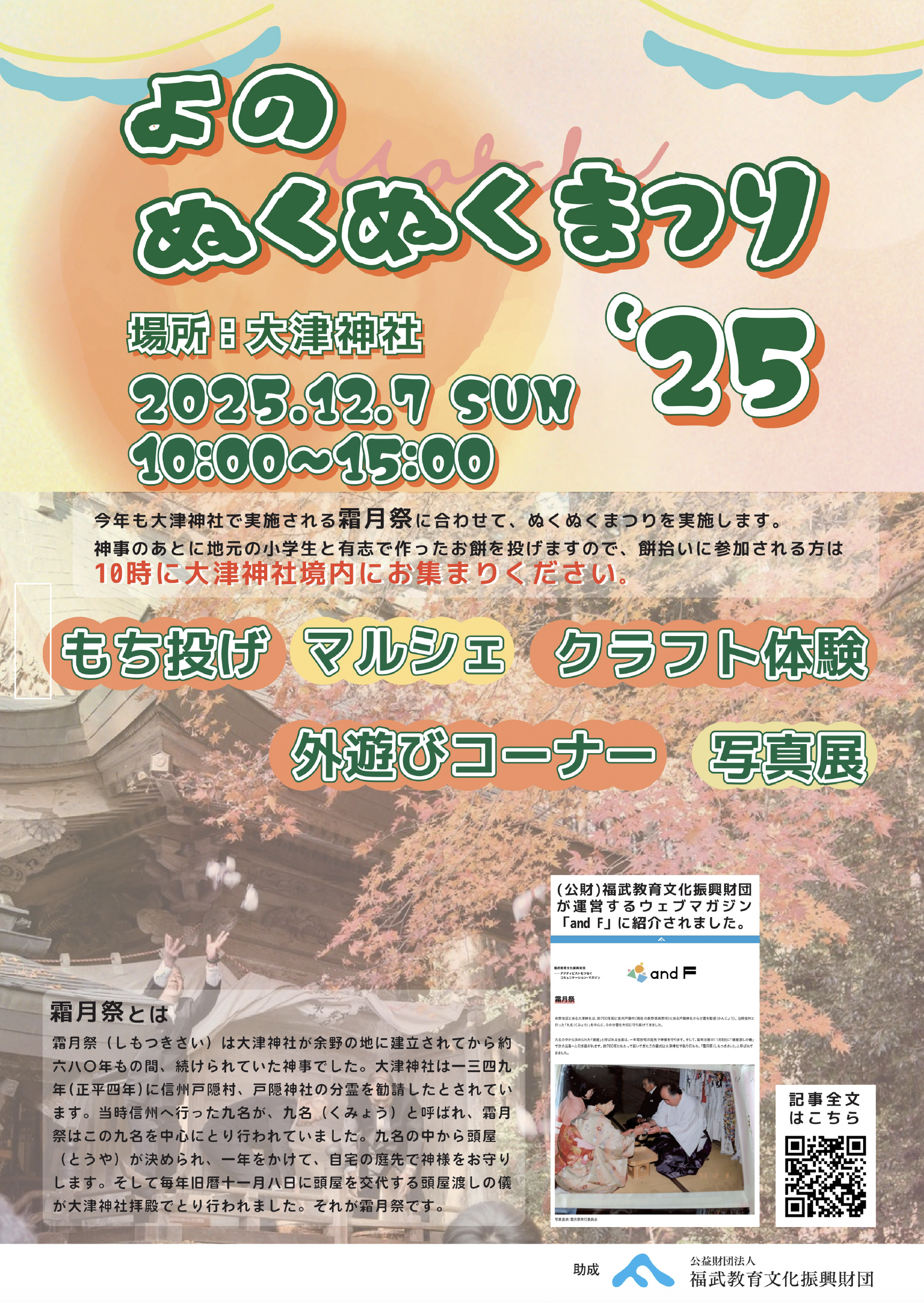 今年も、大津神社で行われる「霜月祭」に合わせて、「よの ぬくぬくまつり」が開催されます。