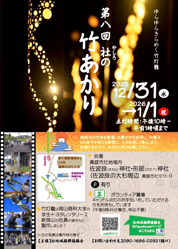 使用される竹灯籠は地、域内の竹林を整備した際の竹を使い、岡山商科大学の学生・トヨタレンタリース新岡山の社員の皆さん・地域の方で共同制作したものです。