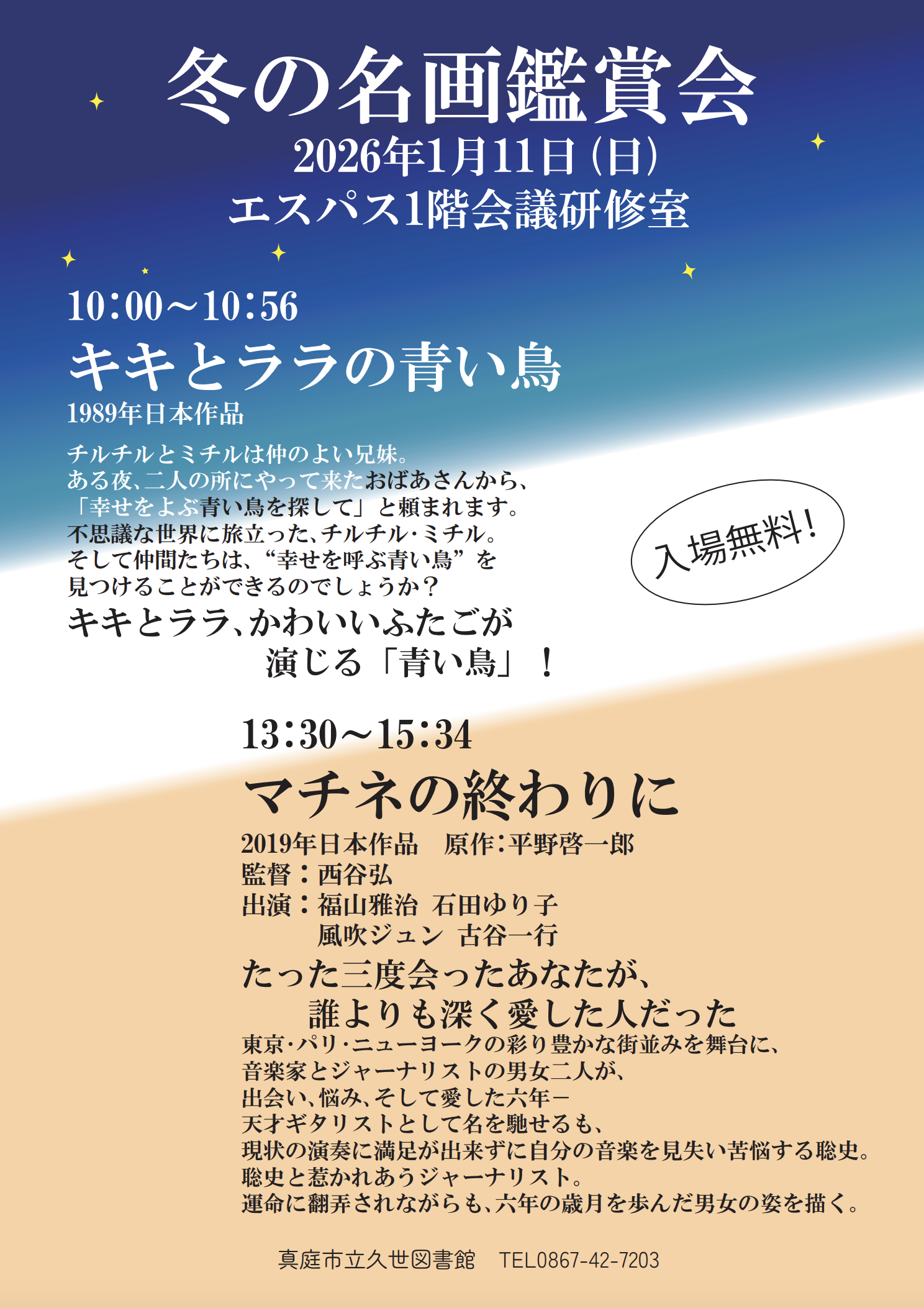 エスパスセンターで、2本の映画が観られる「冬の名画鑑賞会」が行われます。