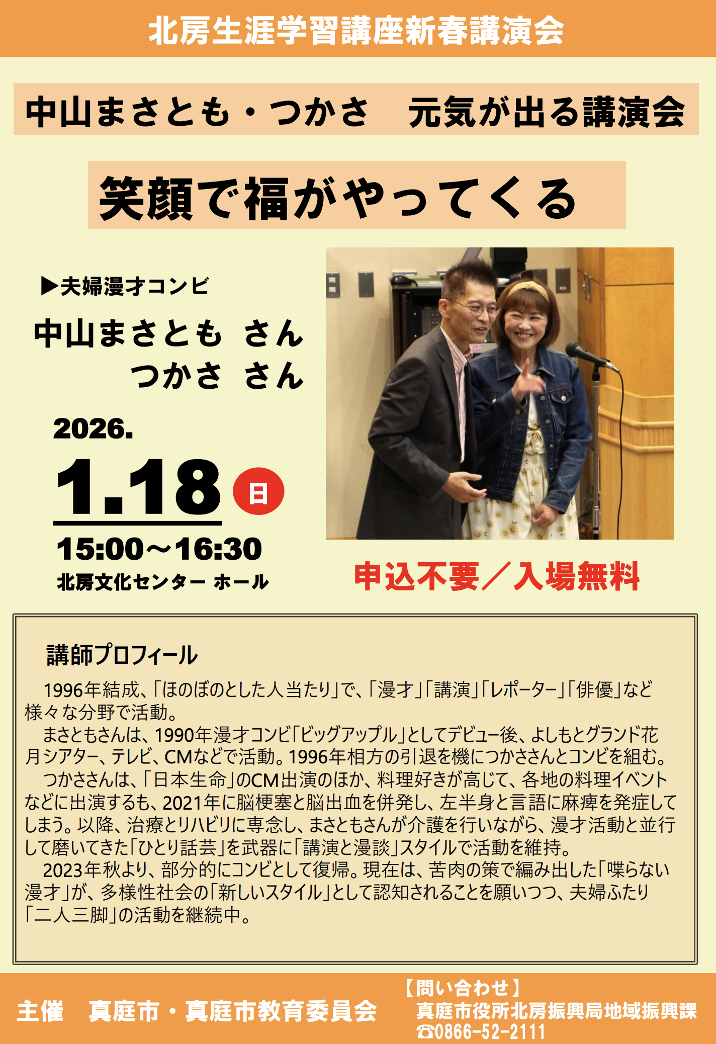 夫婦漫才コンビ 中山まさともさん・つかささんをお招きし、「中山まさとも・つかさ 元気が出る講演会 笑顔で福がやってくる」と題した新春講演会が開催されます。