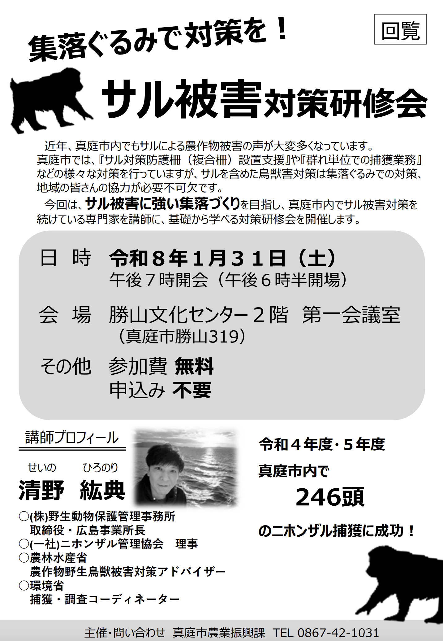 今回の講座では、サル被害に強い集落づくりを目指し、真庭市内でサル被害対策を続けている専門家を講師に、基礎から学べる対策講座を開催します。