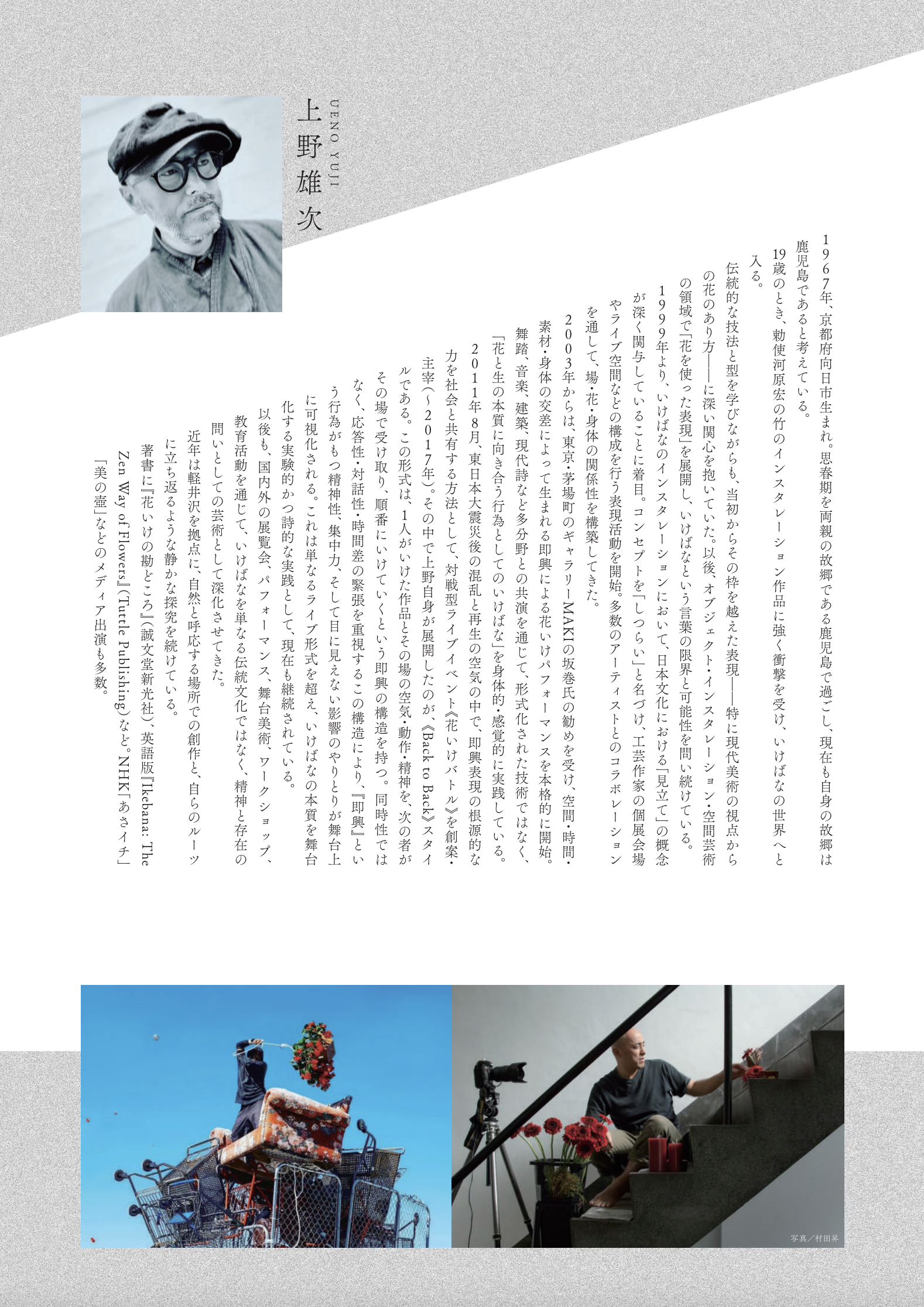 上野さんはいけばなを即興的な行為芸術としてとらえ、命と死、生と空間の接点を探究する花道家・現代アーティストです。