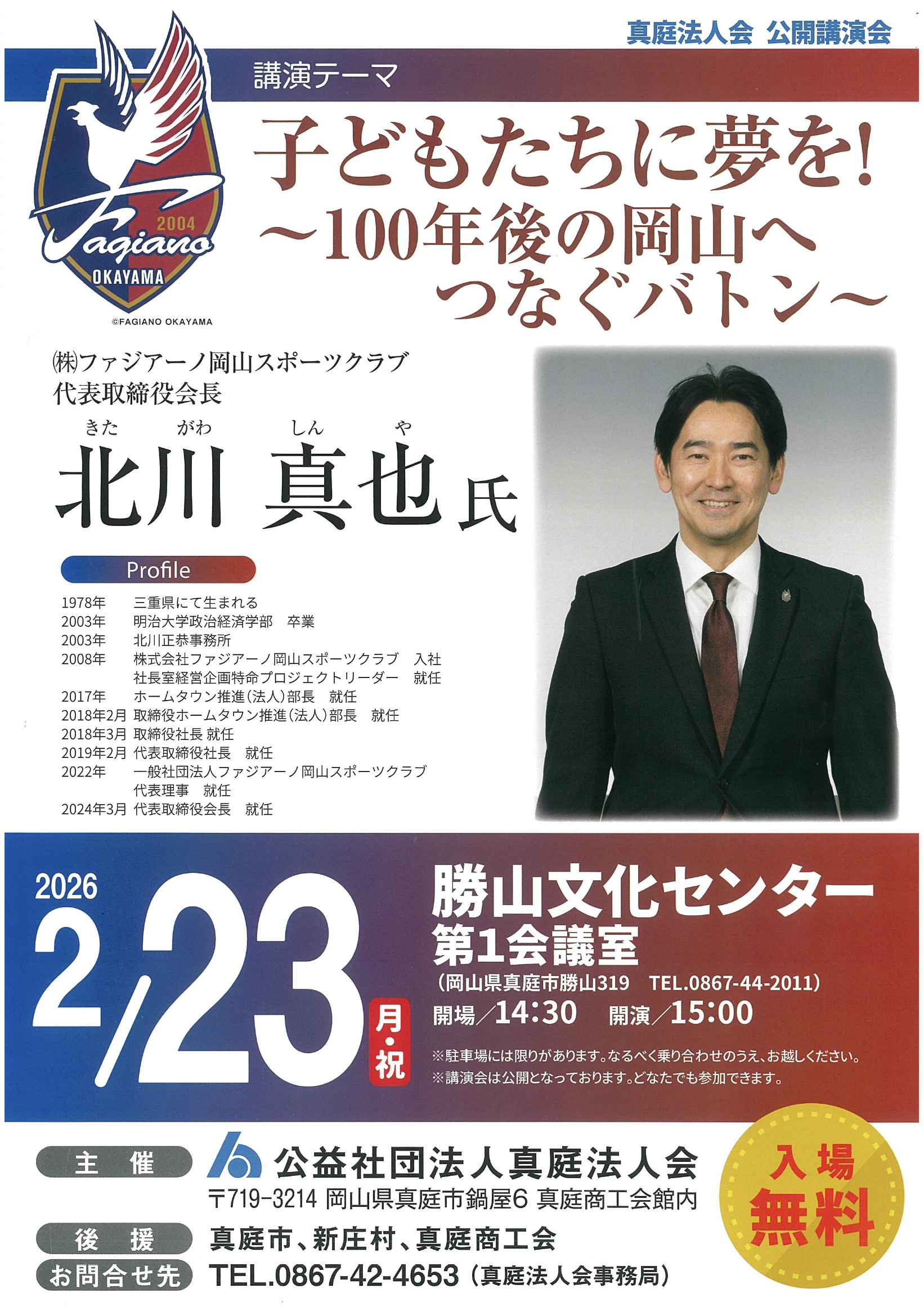 2025年にJ1に昇格し、そして残留を決めたファジアーノ岡山スポーツクラブ会長の北川真也氏の講演会が開催されます。