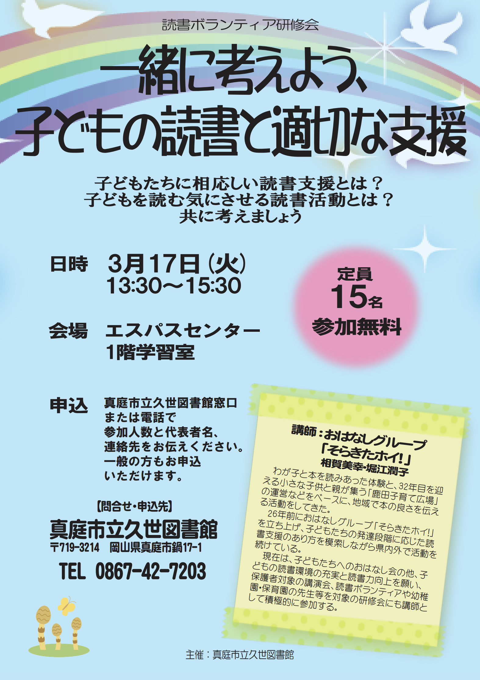 ◆申込・問合せ 久世図書館窓口 / TEL:0867-42-7203(久世図書館)