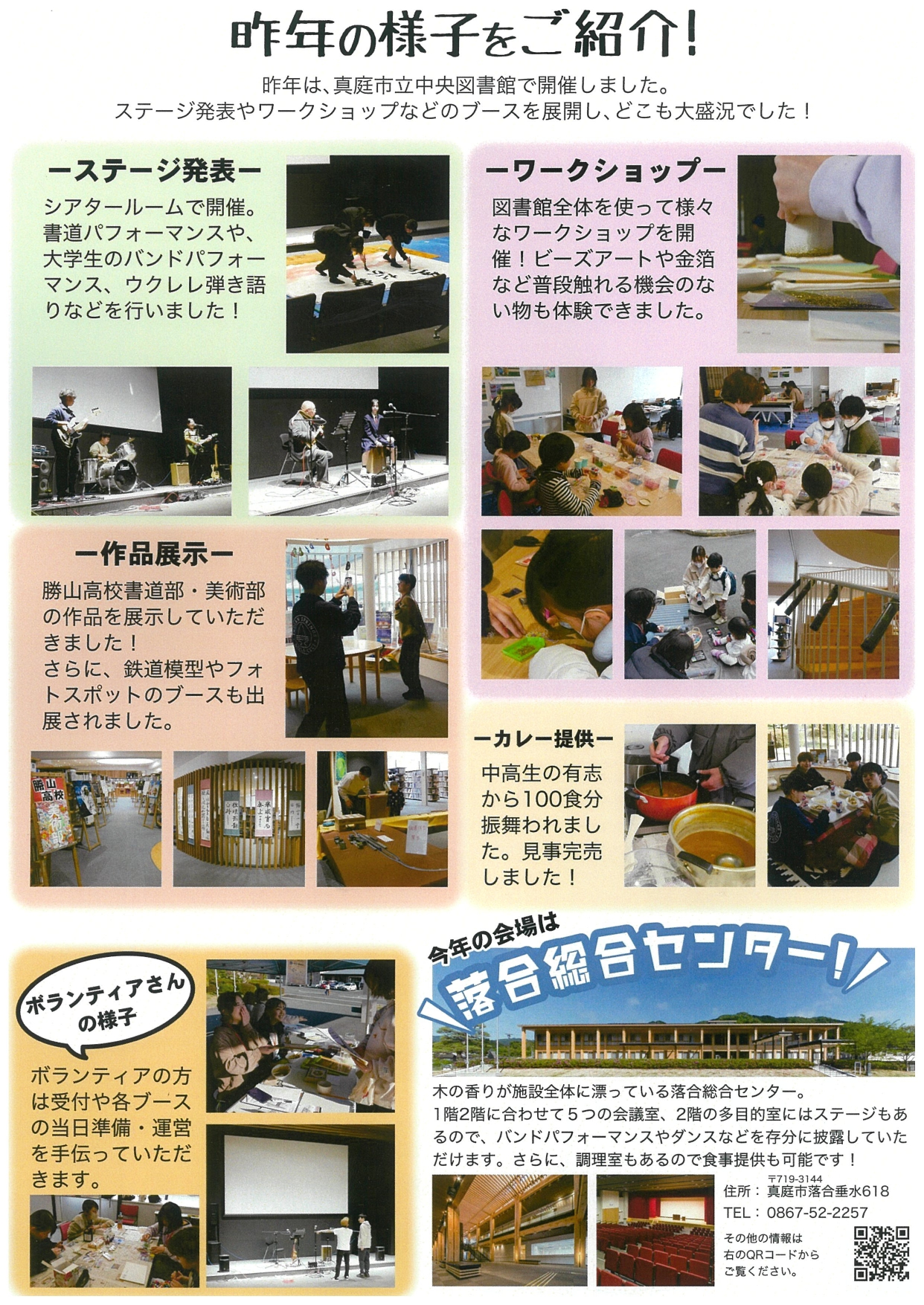 テーマのように、真庭の若者が誰でも創り手になって、発表できる機会を作ろうという想いで、昨年に引き続き2回目の開催となります。