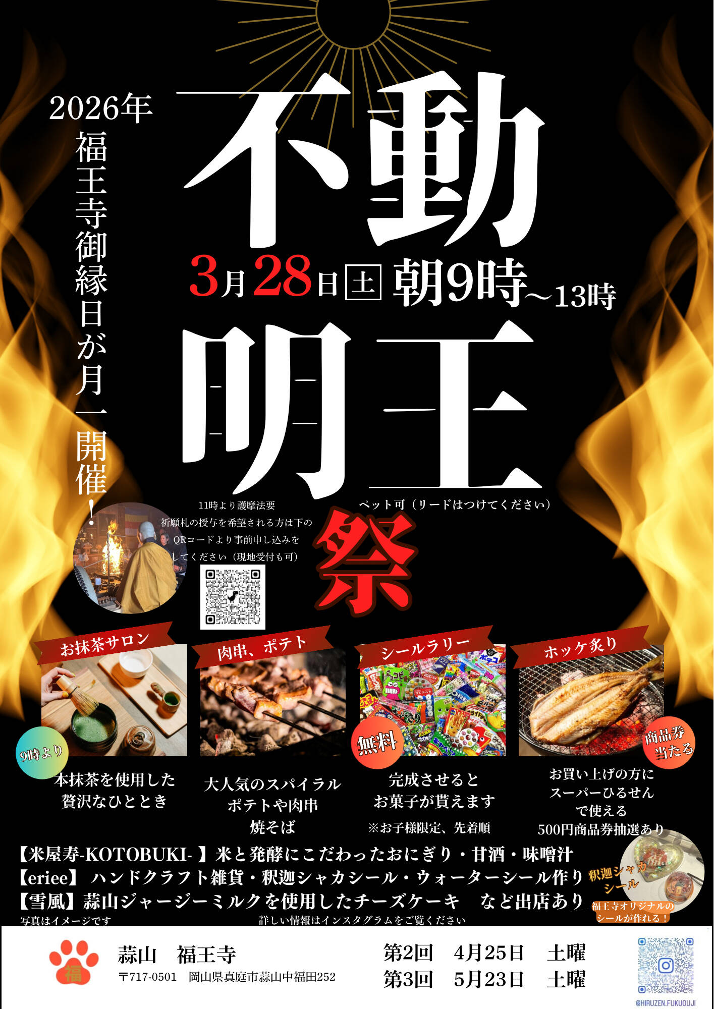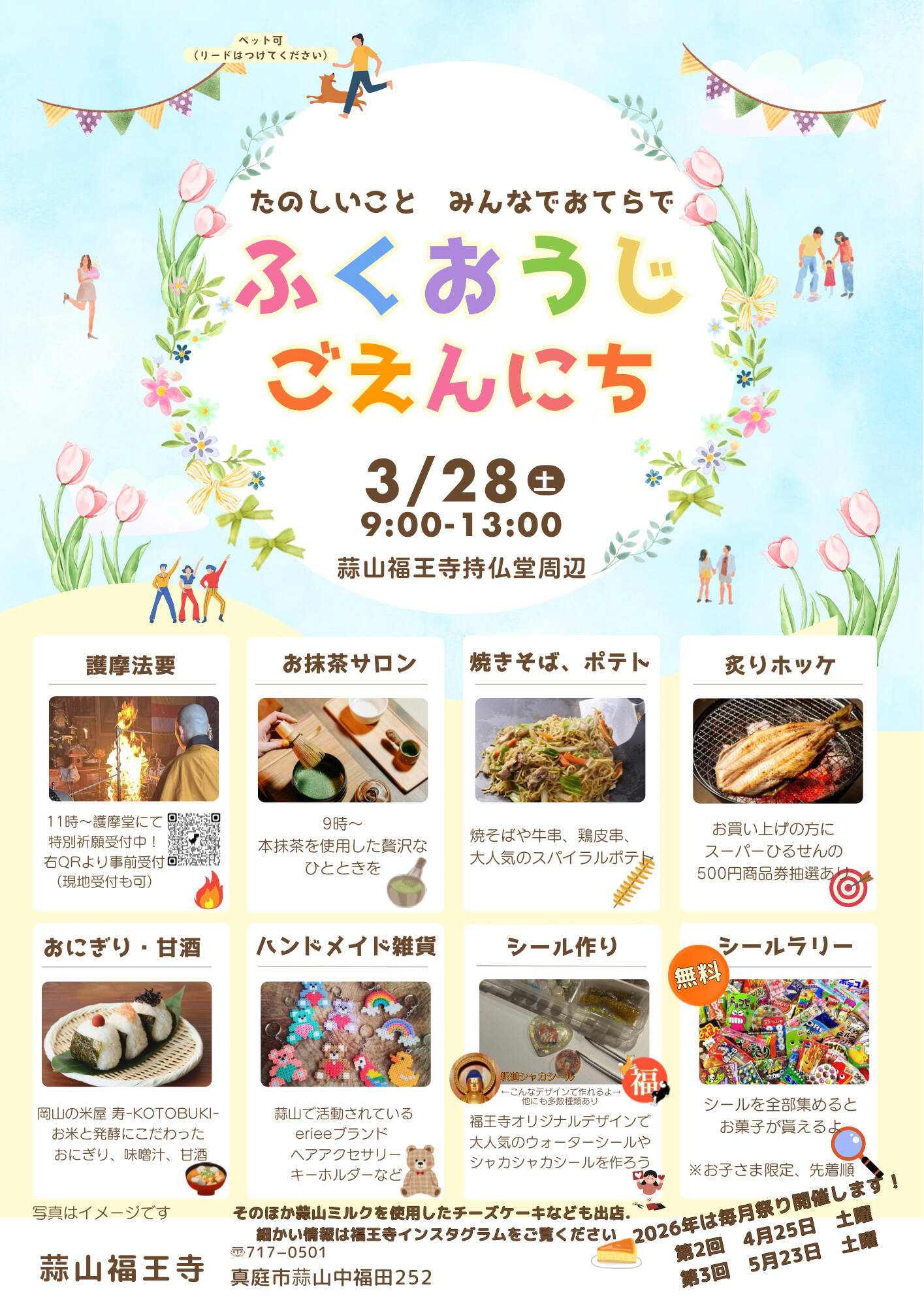 お抹茶サロンややきそば、ポテト、炙りホッケなど食べ物はもちろん、福王寺オリジナルデザインのシールを使ったワークショップなど盛りだくさんの内容です!