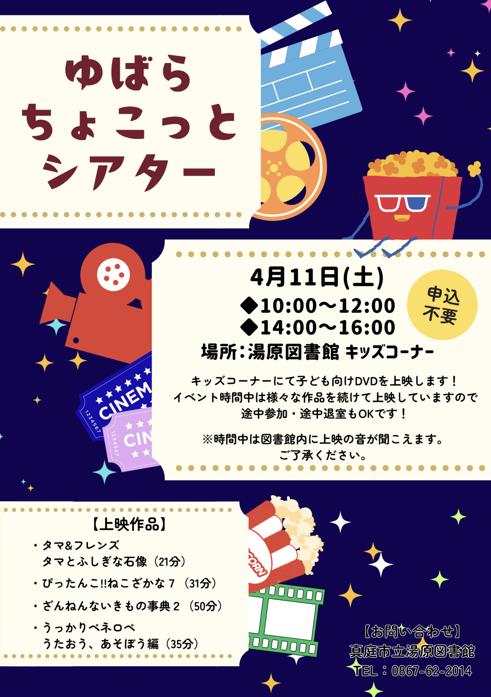 湯原図書館で、子ども向けのDVD上映会が開催されます。